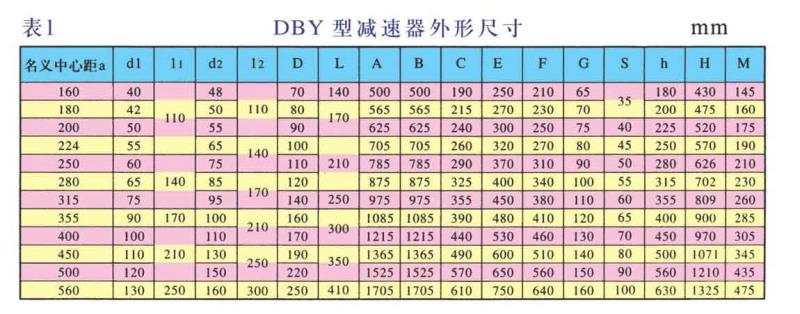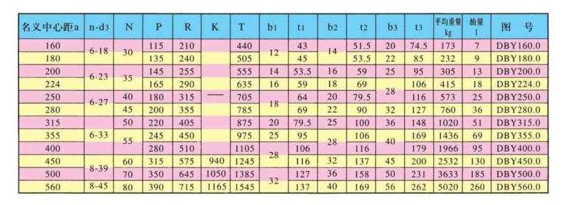 DBY、DBYK、DBZ型减速机各有12种规格,名义中心距为:160,180,200,224,250,280,315,355,400,450,500,560mm每种规格均有5种传动比(8,10,11.2,12.5,14)两种旋向,四种装配型式,分别组成240种减速机。
